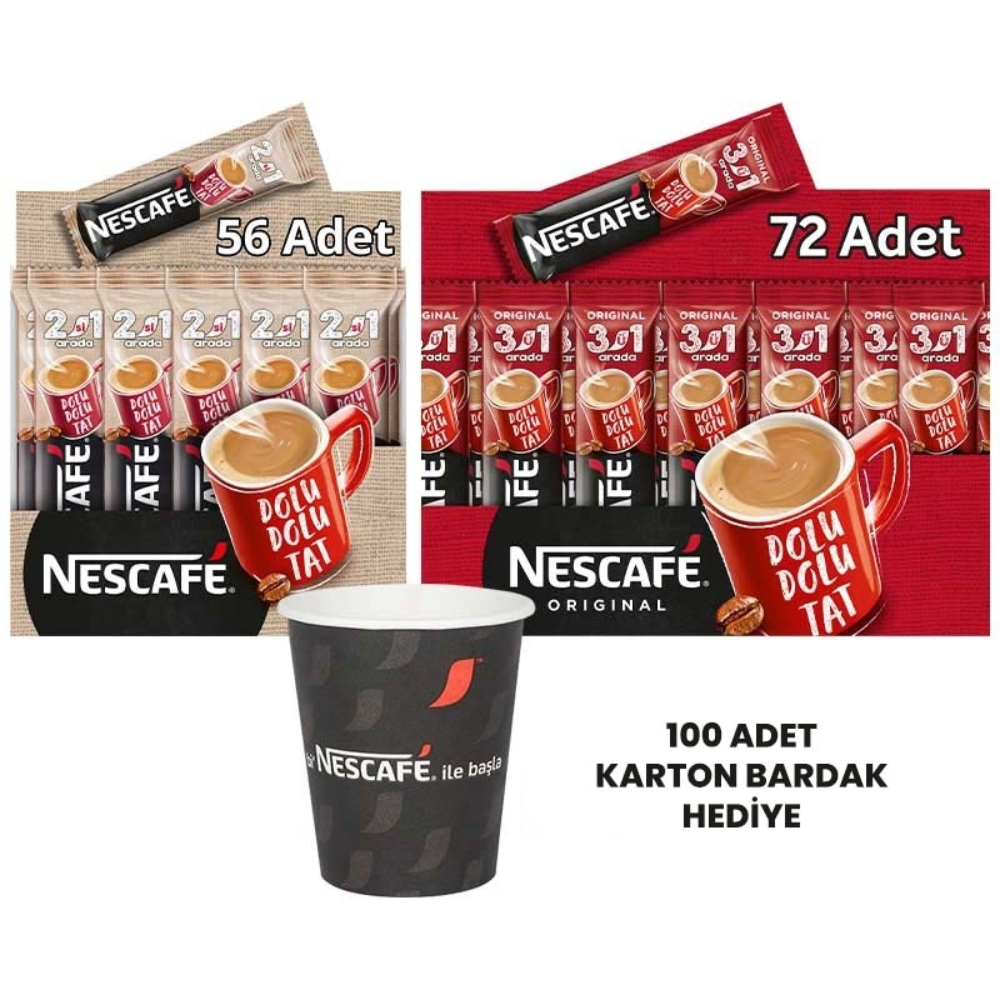 Nescafe 2si1 Arada 10gr 56lı Paket+Nescafe 3ü1 Arada Kahve Original 17,5gr 72li+Nescafe Karton Bardak 100lü Hediyeli